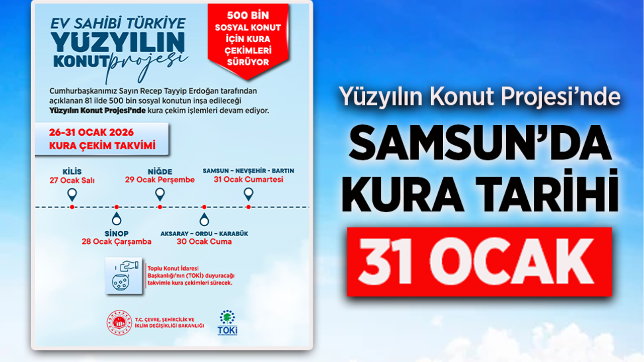 Yeni haftanın takvimine göre 27 Ocak salı günü Kilis'te bin 170, 28 Ocak Çarşamba Sinop'ta 947, 29 Ocak Perşembe Niğde'de 2 bin 604, 30 Ocak Cuma Aksaray'da 2 bin 353, Ordu'da 3 bin 334 ve Karabük'te bin 600, 31 Ocak cumartesi günü ise Samsun'da 6 bin 397, Nevşehir'de 2 bin 368 ve Bartın'da bin 620 konut için kura çekimi yapılacak. 26-31 Ocak haftasında toplam 22 bin 393 sosyal konutun daha hak sahipleri belirlenecek. Böylece 31 Ocak'ta kurası tamamlanan il sayısı 41'e, hak sahipleri belirlenen konut sayısı ise 143 bin 658'e yükselecek.